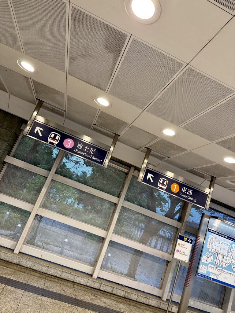 乗り換え。乗ってきた電車が香港行き。乗り換える電車は東涌に戻るかディズニー行きかの2択なので間違えようがありません!
