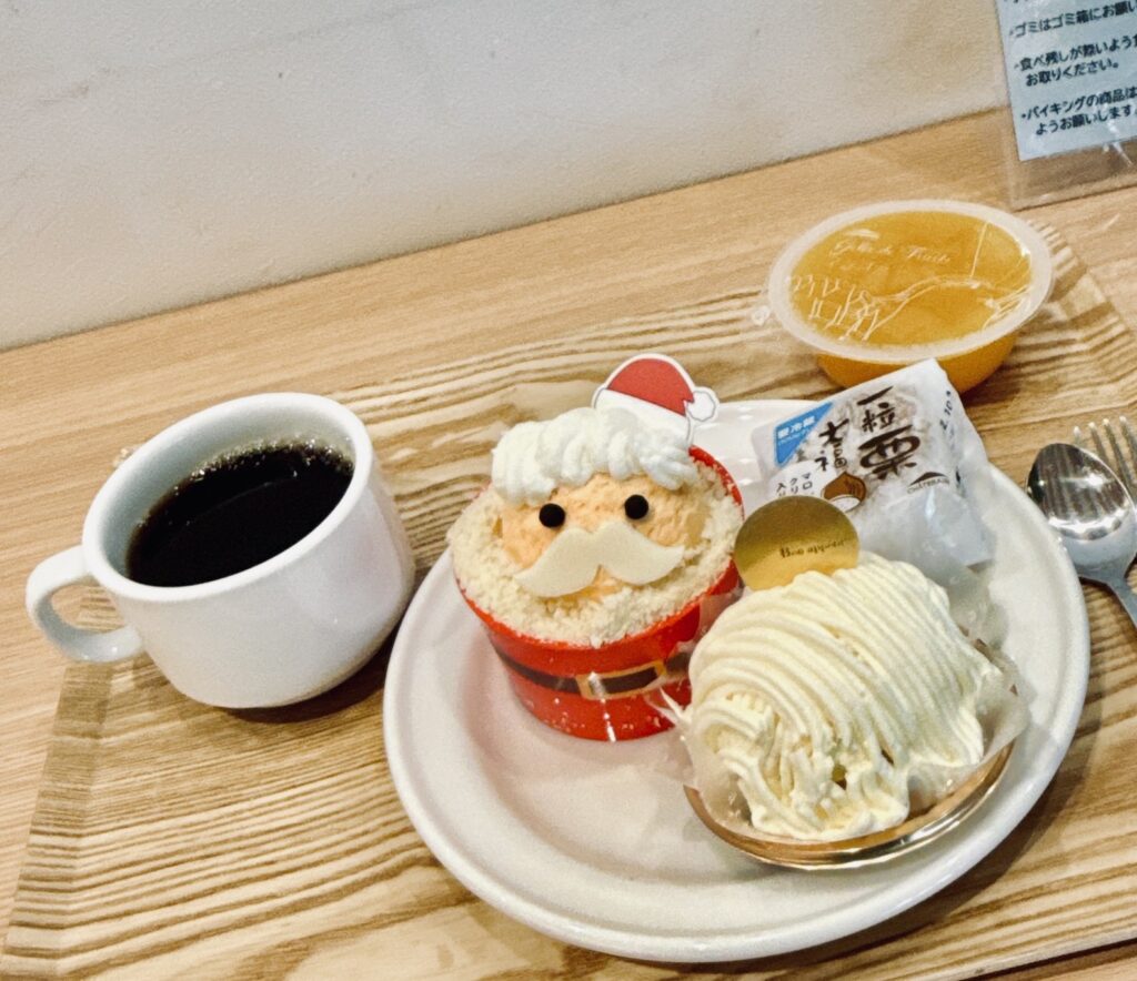まずは1番最初に目についたサンタさんから。キャラメルクリームの下からはいちごやホワイトチョコチップがたくさん出てきて、見ても食べても可愛くて楽しいケーキでした!マスカルポーネのモンブランも栗大福もマンゴーゼリーも、どれも素材の味がしっかり感じられる優しい味♡